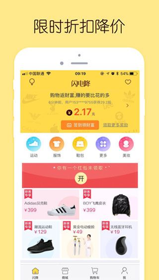 闪电降价安卓版是一款专注正品特卖的时尚购物APP,新用户注册立享500元优惠券,全场折扣1折起,下单再享闪电降,立减高达200元,购物再得闪电股,可提现,可升值。欢迎与各大特卖电商比价,如:唯品会、淘宝、天猫、京东、卷皮、折800、蜜芽等,从此购物更实惠。
