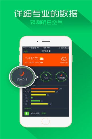 4.使用国际通用的空气质量指数AQI作为衡量标准对PM10和PM2.5等数据7X24小时实时监控, 让您及时掌握最新的空气污染状况。
