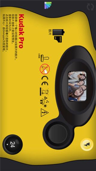 kudak pro模拟一次性相机,一个胶卷拍摄24张。照片冲印必须等待1天,更换新胶卷必须等待一个小时。