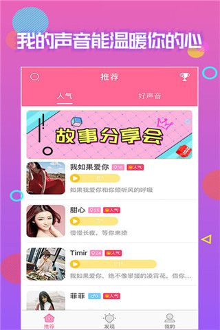 3.这里有众多柔情的,甜美的,知性的,可爱的等等各种声音正在发声,总有一个声音能在这繁忙的世界里陪伴你、治愈你,与你分享内心深处的悄悄话和小秘密。