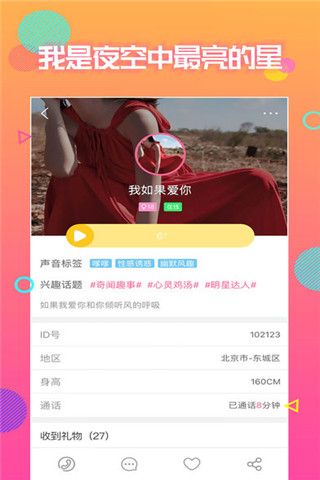 夜声iOS版是一款全新的语音交友软件,在这里,全新的一对一语音交友服务,为用户提供更多的约会互动服务,随时随地都可以邂逅志趣相投的异性朋友,分享你的生活分享你的内心世界哦。给你意想不到的惊喜体验。