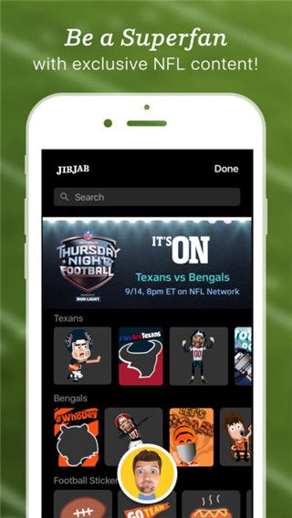 除了1500多种顶级品质之外,JibJab相机还可以将您的粉丝带到一个新的水平,将自己变成一个以NFL为主题的头像,或者通过独家NFL星期四晚上创建个性化的终极舞蹈足球内容在本赛季以全新的方式表达自己的粉丝,欢呼你最喜欢的球队!根据即将到来的比赛,粉丝们的贴纸和球队将在整个赛季动态变化。