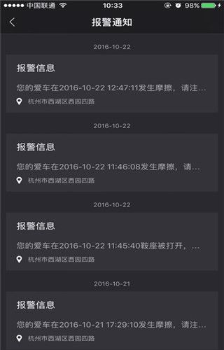 1、[防盗报警]车辆处于设防状态时,发生车辆被震动、车辆电池被拔、车辆被搬离原位置一定距离等三种情况时,系统会判断风险级别,通过APP和手机短信向车主发送报警通知。