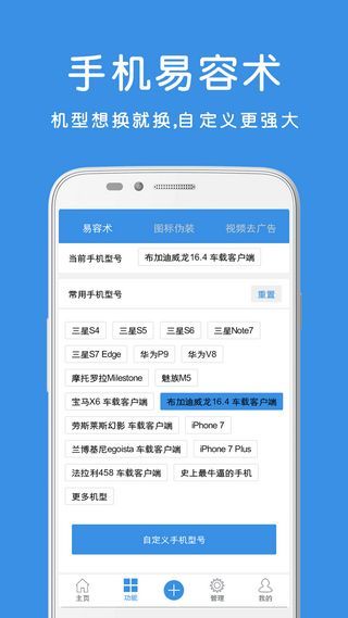 易容术是江湖中传言很高深的手艺,现在已经完美移植到手机上,手机易容术app手机版更改手机型号秒变iphone7的app应用,比如手机QQiPhone7在线、微博客户端来自iPhone7操作体验非常的丰富!手机易容术app手机版可以轻松的实现应用多开、手机型号更改、存储管理以及进程管理等功能!