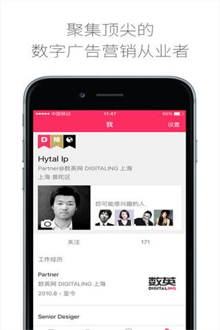数英网iOS版是一款广告营销设计和招聘类手机软件,这里集结了来自营销、新媒体、电商、互联网及无线互联网等数字领域人才的智慧结晶。也是广告营销者的聚集地,用户可以进行互动交流,致力于整合数字业界信息,受益于访问者。
