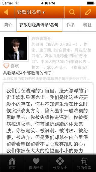 句子迷IOS版是一个手机上的句子摘抄本,每天都有佳句美句的发布,你可以寻找自己喜欢的进行收藏,也可在这里发布你喜欢的句子,与别人一同分享。
