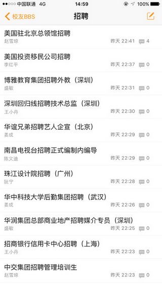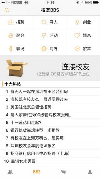 2、校友BBS:和校友交流招聘、创业、聚会、婚恋、职场等话题;